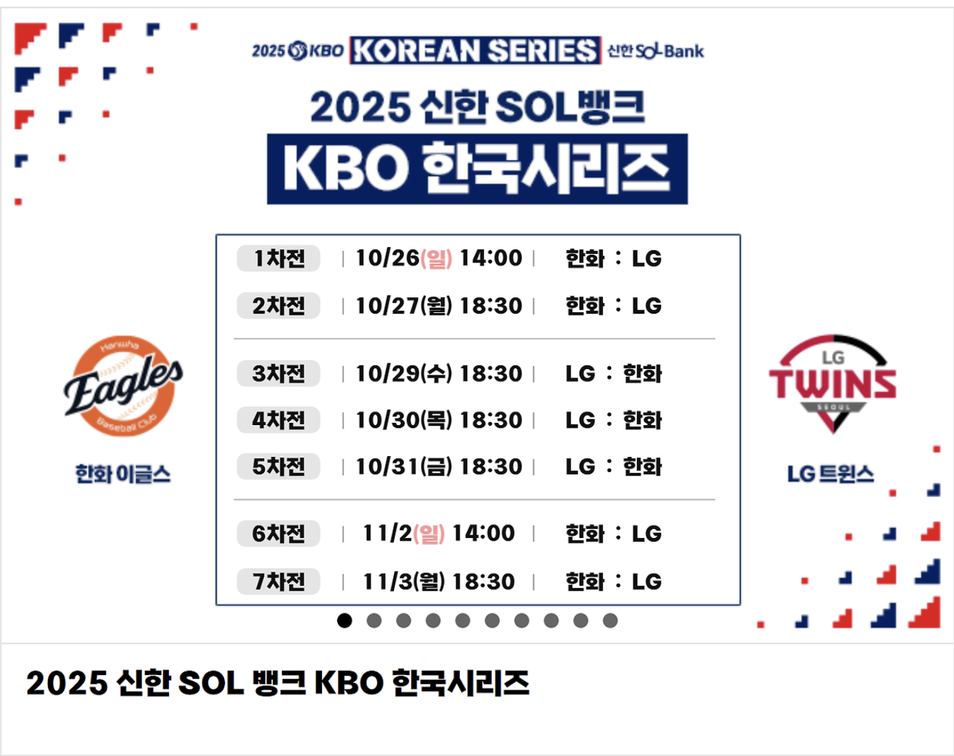2025년 한국시리즈는 한화 이글스 🆚 LG 트윈스의 빅매치로, 서울 잠실야구장과 대전 한화생명이글스파크에서 7전 4선승제로 진행됩니다. 주말 경기는 오후 2시, 평일 경기는 오후 6시 30분에 열리며, 모든 경기는 KBO 공식 중계로 생중계됩니다. 이번 시즌은 각 팀의 팬층이 두터워 예매 경쟁이 유례없이 치열할 전망입니다.