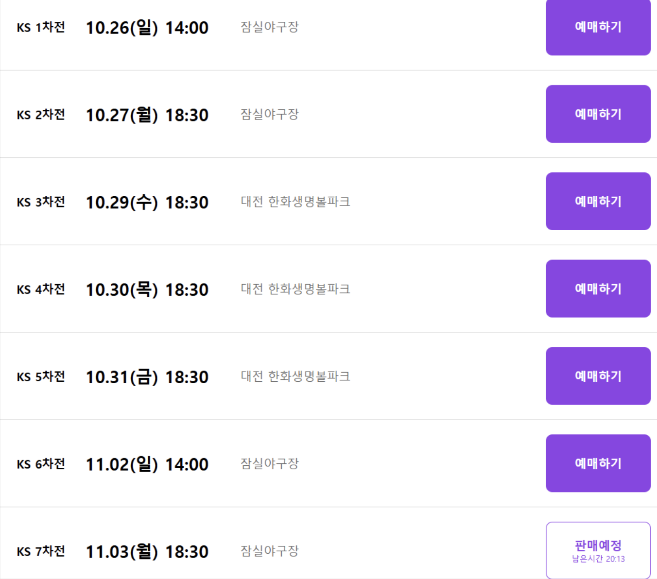 한국시리즈 예매는 NOL 티켓을 통해 온라인 100% 예매로만 진행됩니다. 현장 판매는 없으며, 경기 이틀 전 오후 2시에 오픈됩니다. 1인당 최대 4매까지 예매 가능하며, 구단별 예매는 순차적으로 진행됩니다. 원활한 예매를 위해 반드시 사전 로그인 및 결제수단 등록을 권장합니다.